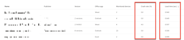 Övervakning av Office-applikationernas stabilitet och hälsa. Man får t.ex information om hur ofta specifika applikationer och plugins kraschar och vilka som är snabba respektive tar lång tid att ladda. Ofta hittar man plugins här som man inte visste fanns i verksamheten.