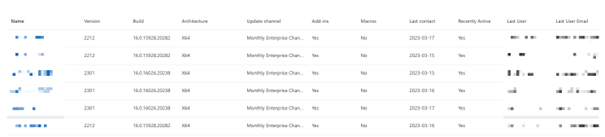 Här finns information om datorerna i er organisation som använder Office-applikationer. Information om vilken kanal och version och senast inloggad användare finns även tillgängligt.