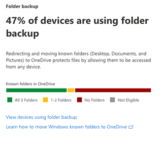 Här får du information om vilka användare i verksamheten som har synkroniseringsproblem samt information om vilka mappar som säkerhetskopieras till Onedrive.