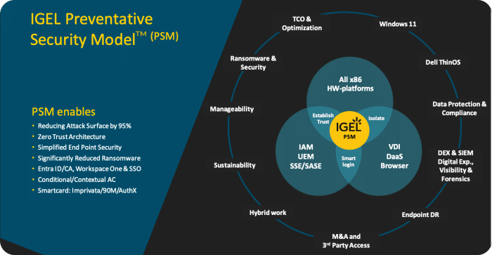 Från att historiskt varit ett företag som många nog förknippar med tunna klienter, har IGEL de senaste åren gjort en imponerande resa där man förflyttat sig från att vara en hårdvaru-leverantör till att utgöra en plattform med sitt säkra operativsystem IGEL OS. Denna plattform utgör en arena för många olika produkter att verka och samexistera i. Det finns idag inga kända intrång mot detta enbart läsbara operativsystem, en ack så viktig aspekt i dagens säkerhetsläge. En stor anledning till denna säkerhet är IGELs så kallade Preventative Security Model (PSM) som i korthet handlar om ett operativsystem som på enheten enbart är läsbart, eventuell konfiguration levereras via det centrala manageringsverktyget UMS – Universal Management Suite. IGELs plattform och enheter anslutna till den är så kallat ”Built to purpose” dvs att enheten och användaren ser och får enbart tillgång till vad användaren behöver, på detta sätt reduceras även attackytan markant samtidigt som operativsystem och appars lagringskrav reduceras till ett minimum.